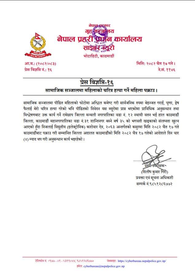 काठमाडौँ । महिलाको चरित्र हत्या गरेको आरोपमा प्रहरीले रेस्लर भगवती खड्कालाई पक्राउ गरेको छ । रामेछापको मन्थली नगरपालिका–१२ घर भएर शान्तिनगर बस्ने खड्कालाई काठमाडौँबाट पक्राउ गरिएको साइबर ब्यूरोका एसपी दिलीप कुमार गिरीले जानकारी दिएका छन् ।