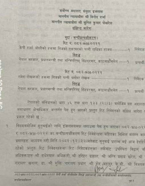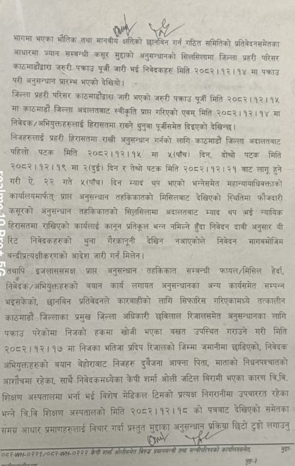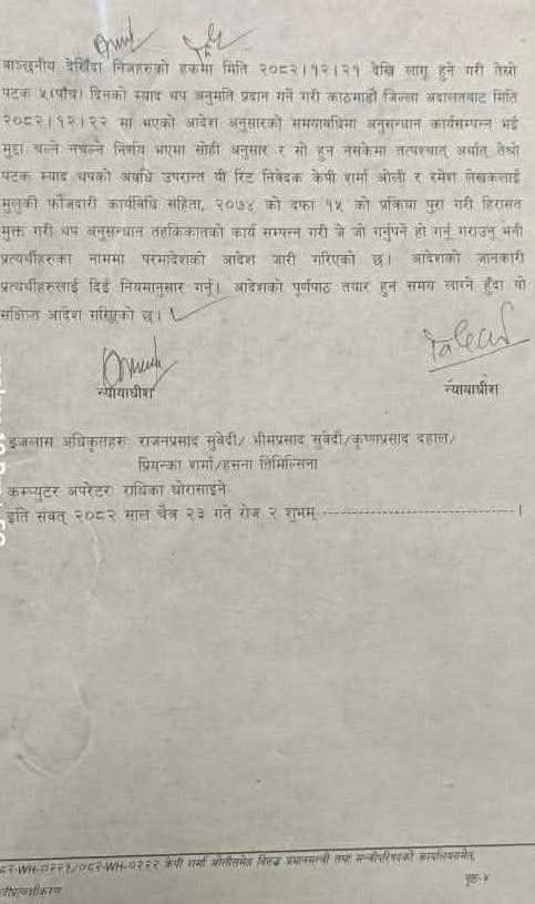 ‘उनीहरूको हकमा चैत २१ गतेदेखि लागुहुने गरी तेस्रो पटक ५ दिनको म्याद थप अनुमति गर्ने गरी काठमाडौं जिल्ला अदालतबाट भएको आदेश अनुसारको समयअवधिमा अनुसन्धान कार्य सम्पन्न भई मुद्दा चल्ने वा नचल्ने निर्णय भएमा सोही अनुसार र सो हुन नसकेमा तत्पश्चात अर्थात, तेस्रो पटक थपिएको म्याद थपको अवधि उपरान्त यी रिट निवेदक केपी शर्मा ओली र रमेश लेखकलाई … प्रक्रिया पूरा गरी हिरासत मुक्त गरी थप अनुसन्धान तहकिकातको कार्य सम्पन्न गरी जे जो गर्नुपर्ने हो गर्नु गराउनु भनी परमादेश जारी गरिएको छ,’ आदेशमा भनिएको छ।