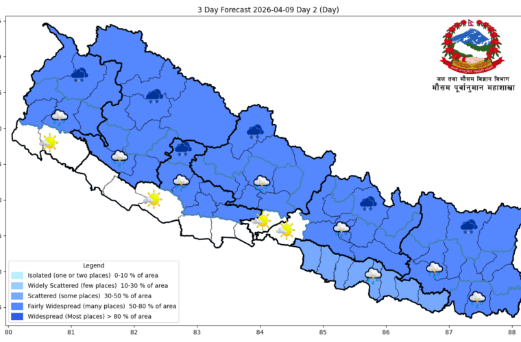 त्यसैगरी, आज राति कोशी प्रदेशलगायत देशका हिमाली भागमा साधारणतया बदली रहने, बाँकी पहाडी भागमा आंशिक बदली रहने तथा तराई भेगमा मुख्यतया मौसम सफा रहने छ । कोशी र गण्डकी प्रदेशका पहाडी तथा हिमाली भागका केही स्थान तथा अन्य हिमाली भागका एकदुई स्थानमा मेघगर्जन र चट्याङसहित हल्का वर्षा वा हिमपात हुन सक्ने सम्भावना छ ।