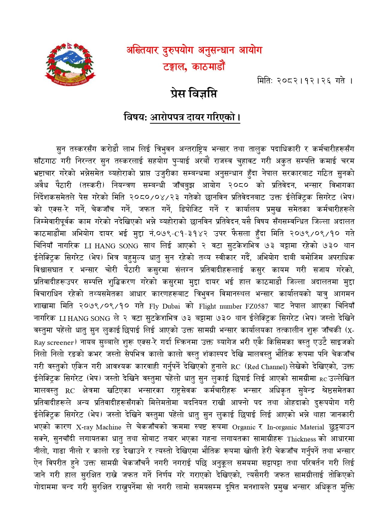 काठमाडौँ । अख्तियार दुरुपयोग अनुसन्धान आयोगले विद्युतीय चुरोट (भेप) मा लुकाएर गरिएको सुन तस्करीमा संलग्न रहेको अभियोगमा पूर्वसभामुख कृष्णबहादुर महरासहित २८ जनाविरुद्ध मुद्दा दायर गरेको छ ।