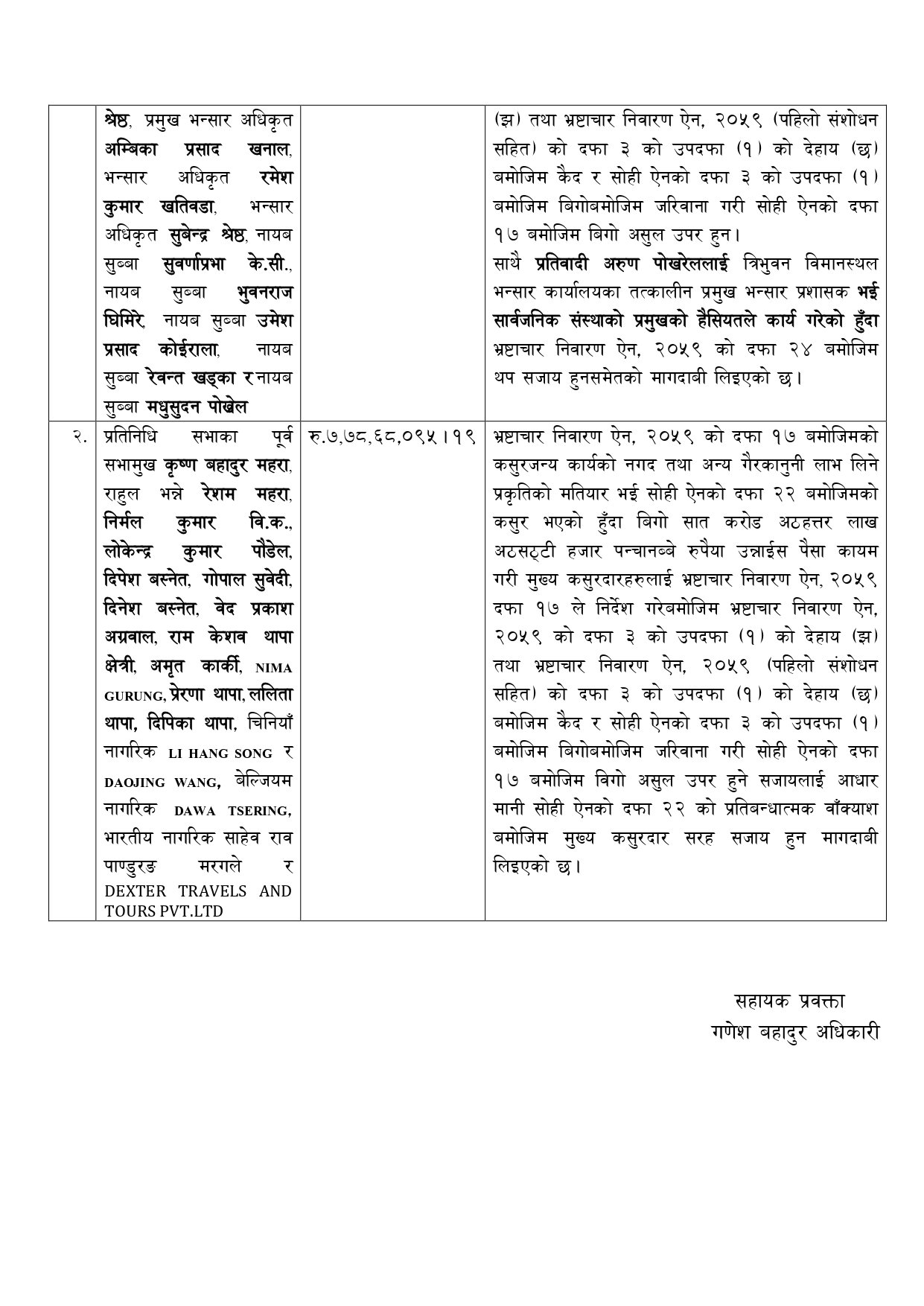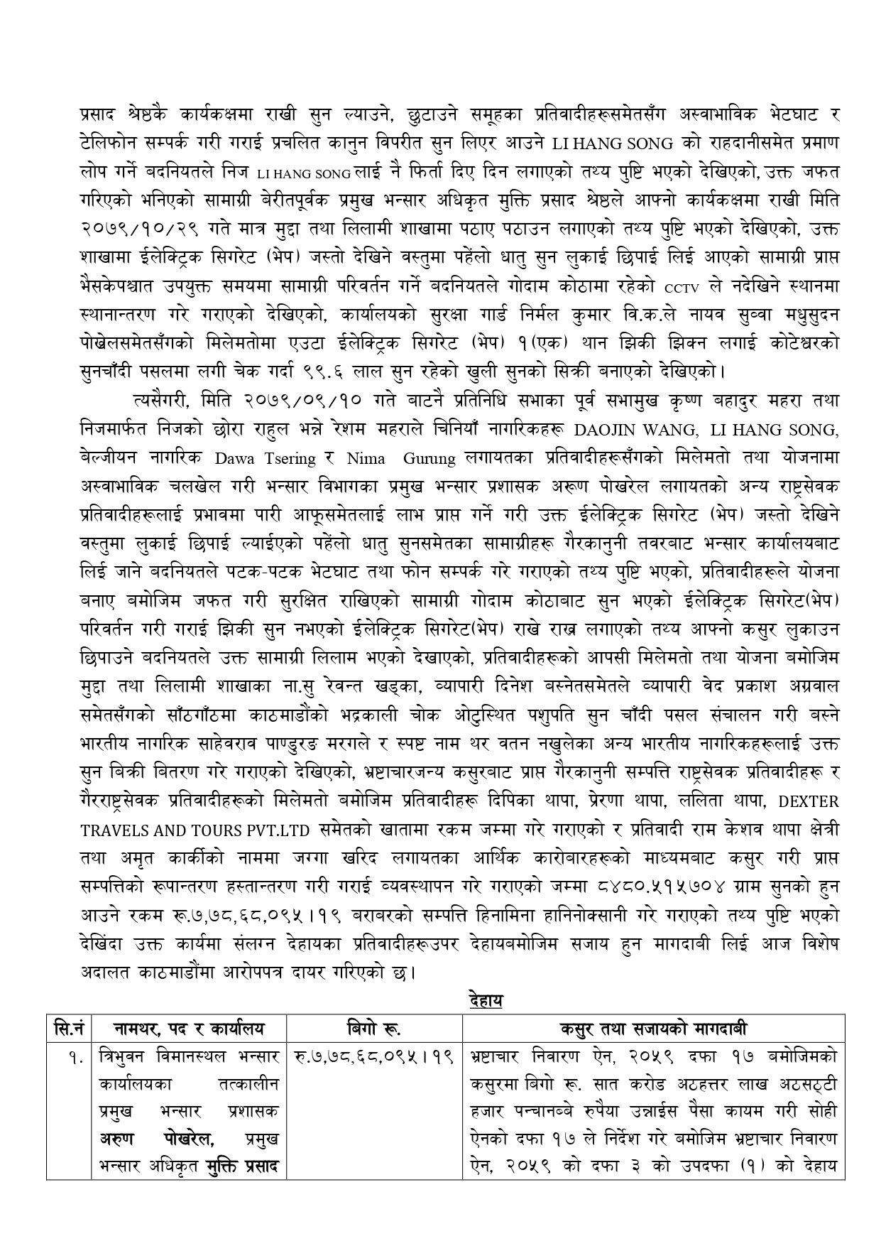 अख्तियारले त्रिभुवन विमानस्थल भन्सार कार्यालयका तत्कालीन प्रमुख भन्सार प्रशासक अरुण पोखरेल, प्रमुख भन्सार अधिकृत मुक्ति प्रसाद श्रेष्ठ, प्रमुख भन्सार अधिकृत अम्बिका प्रसाद खनाल, भन्सार अधिकृत रमेश कुमार खतिवडा, भन्सार अधिकृत सुबेन्द्र श्रेष्ठ, नायब सुब्बा सुवर्णाप्रभा केसी, नायब सुब्बा भुवनराज घिमिरे, नायब सुब्बा उमेश प्रसाद कोईराला, नायब सुब्बा रेवन्त खड्का र नायब सुब्बा मधुसुदन पोखरेल, महराका छोरा, निर्मल कुमार विक, लोकेन्द्र कुमार पौडेल, दिपेश बस्नेत, गोपाल सुवेदी, दिनेश बस्नेत, वेदप्रकाश अग्रवाल, राम केशव थापा क्षेत्री, अमृत कार्की, निमा गुरुङ, प्रेरणा थापा, ललिता थापा, दिपिका थापा, चिनियाँ नागरिक लि हाङ सङ, दाओजिङ वाङ, बेल्जियम नागरिक दावा छिरिङ, भारतीय नागरिक साहेव राव पाण्डुरङ मरगले र डेक्सटर ट्राभल्स एण्ड टूर कम्पनीलाई प्रतिवादी बनाएको छ।