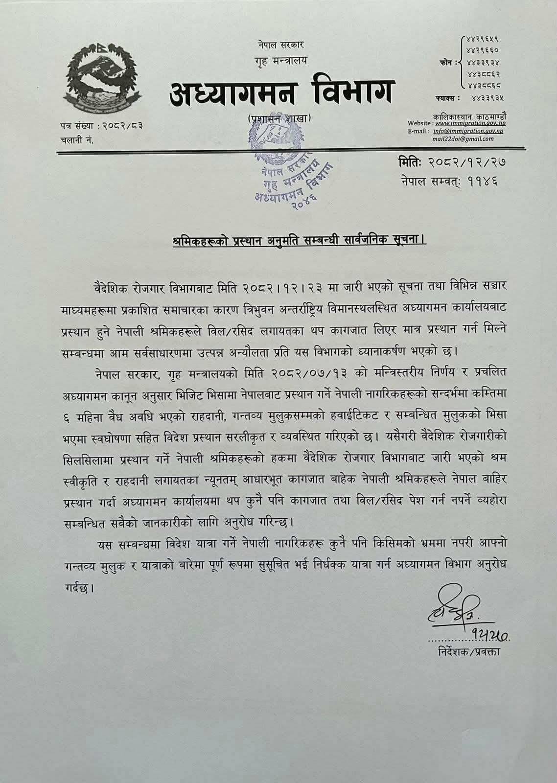 विभागले भनेको छ, ‘वैदेशिक रोजगारीको सिलसिलामा प्रस्थान गर्ने नेपाली श्रमिकहरूको हकमा वैदेशिक रोजगार विभागबाट जारी भएको श्रम स्वीकृति र राहदानीलगायतका न्यूनतम आधारभूत कागजातबाहेक नेपाली श्रमिकहरूले नेपाल बाहिर प्रस्थान गर्दा अध्यागमन कार्यालयमा थप कुनै पनि कागजात तथा बिल/रसिद पेस गर्न नपर्ने बेहोरा सम्बन्धित सबैको जानकारीको लागि अनुरोध गरिन्छ।’