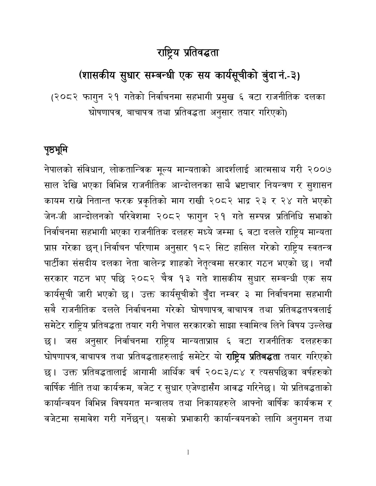 प्रधानमन्त्री तथा मन्त्रिपरिषद् कार्यालयले ‘राष्ट्रिय प्रतिबद्धता’को लागि सुझाव मागेको हो । फागुन २१ को निर्वाचनमा राष्ट्रिय मान्यता प्राप्त गरेका ६ वटा राजनीतिक दलहरुका घोषणापत्र/वाचापत्र//प्रतिबद्धतापत्रका आधारमा ‘राष्ट्रिय प्रतिबद्धता”को मस्यौदा तयार पारिएको हो ।