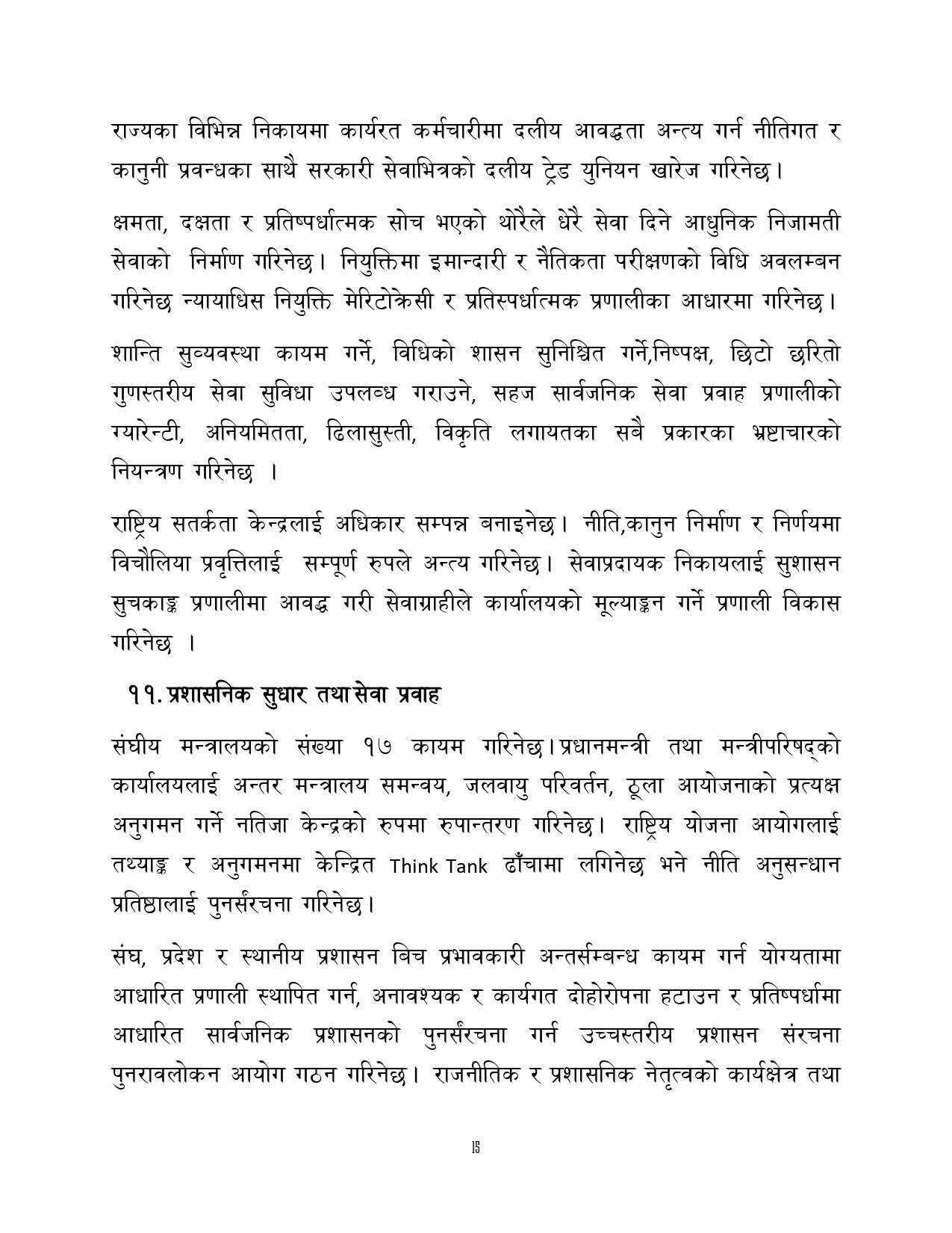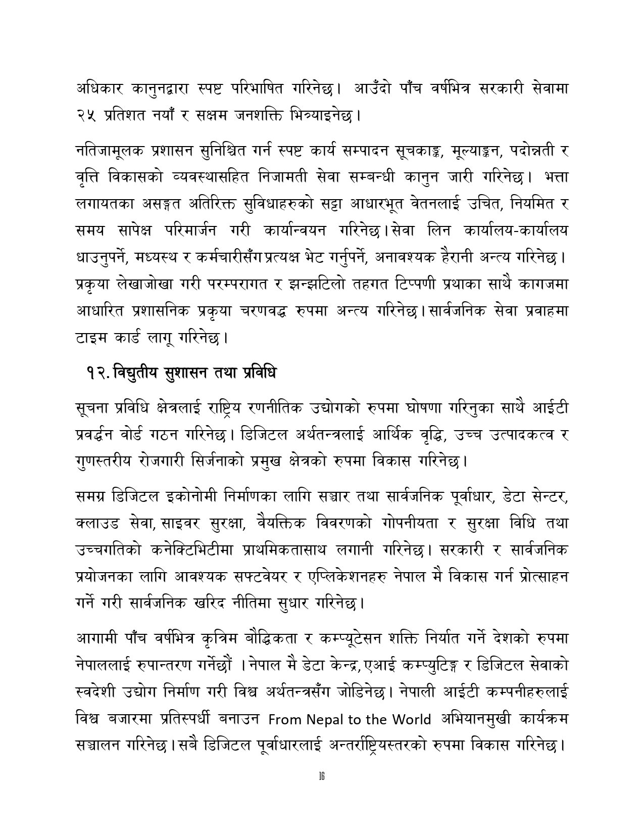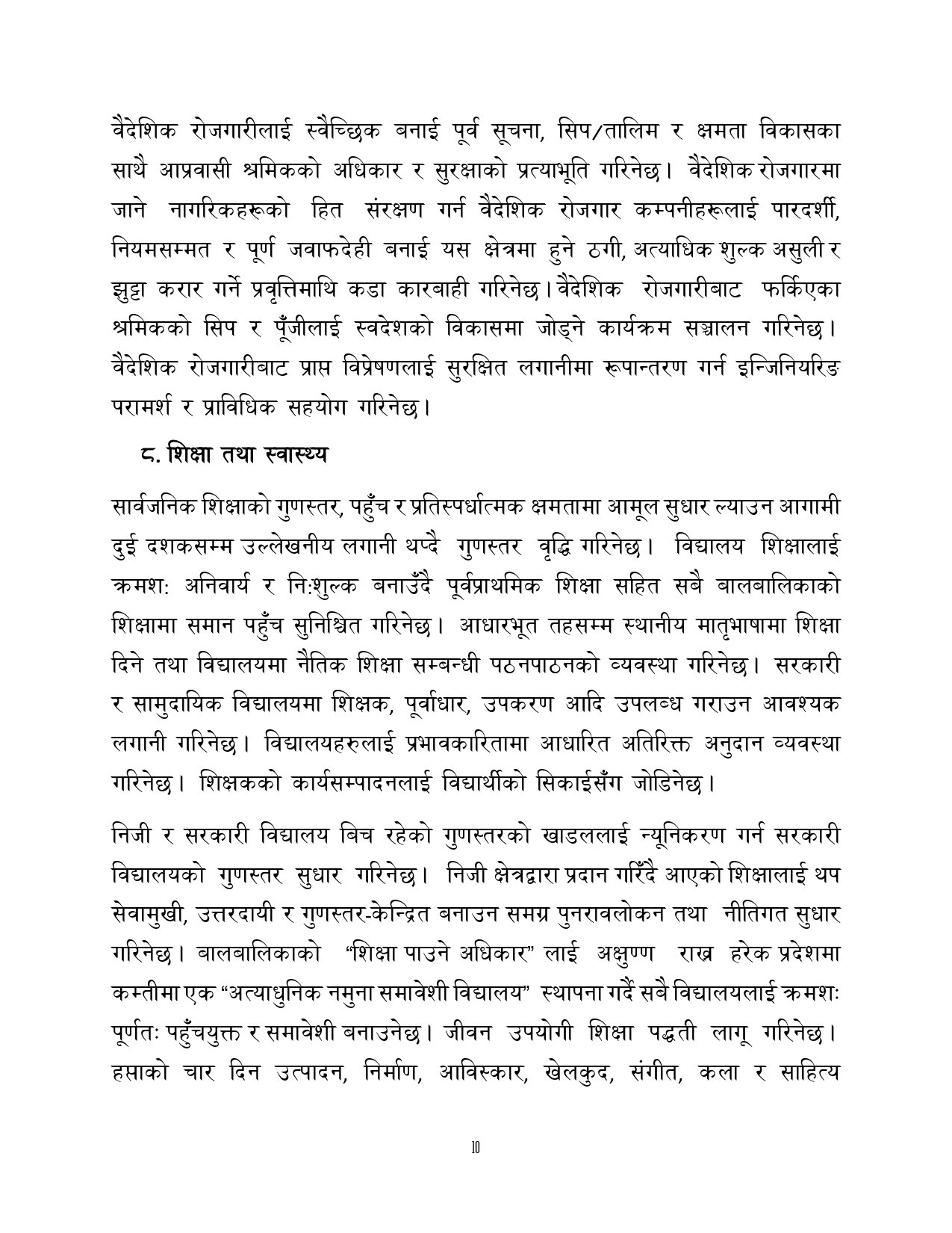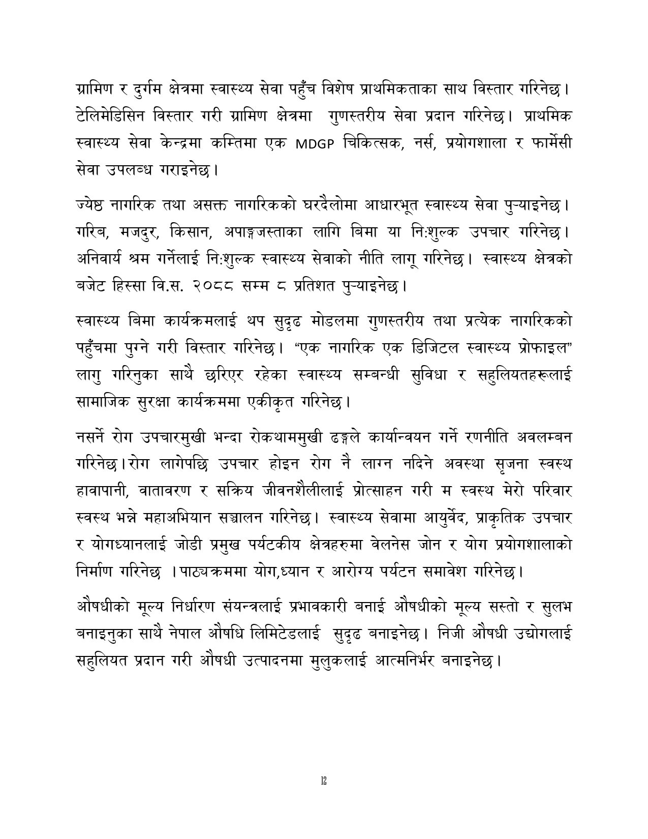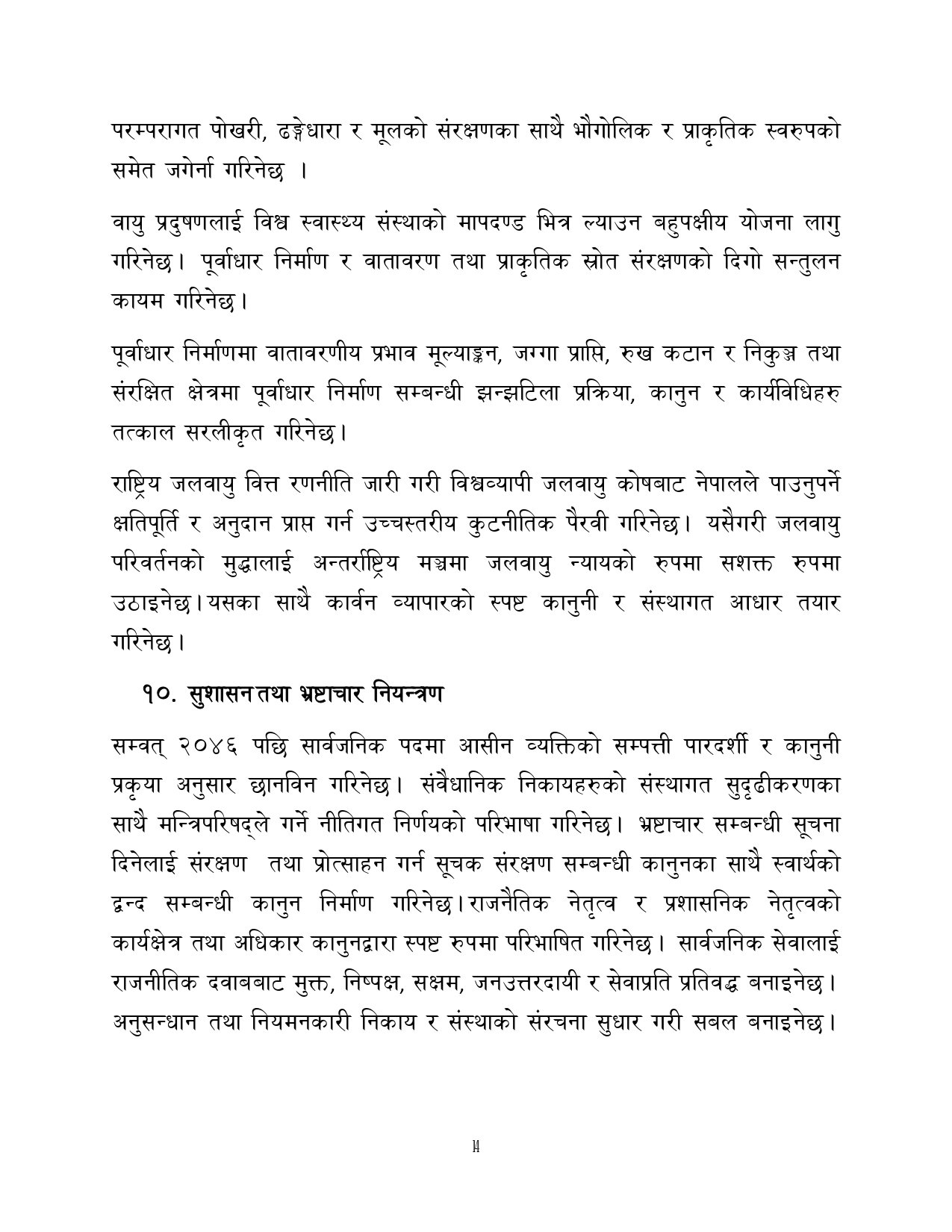 त्यसैगरी रोजगारी र समृद्धि, शिक्षा र स्वास्थ्य, वन वातावरण र जलवायु परिवर्तन, सुशासन र भ्रष्टाचार नियन्त्रण, प्रशासनिक सुधार र सेवा प्रवाह, विद्युतीय सुशासन र प्रविधिको क्षेत्रमा अवधारणापत्र माग भएको छ ।