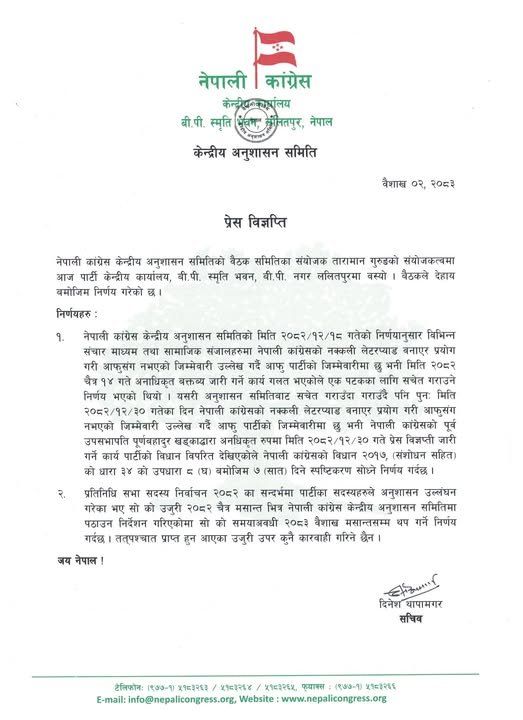 यसअघि पनि विज्ञप्ति निकाल्दा सचेत गराइएको कांग्रेसले जनाएको छ । यसअघि सचेत गराउँदा समेत अटेर गरेर नक्कली लेटरप्याड प्रयोग गरेर पार्टीको विधान विपरीत कार्य गरेकाले स्पष्टीकरण सोधिएको समितिले जनाएको छ ।