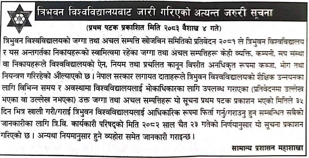 काठमाडौँ । त्रिभुवन विश्वविद्यालय (त्रिवि) ले आफ्नो स्वामित्वमा रहेका जग्गा तथा अचल सम्पत्ति अनधिकृत रूपमा कब्जा गर्ने व्यक्ति, संस्था र कम्पनीहरूलाई ३५ दिनभित्र ती सम्पत्ति फिर्ता गर्न अल्टिमेटम दिएको छ । विश्वविद्यालयको कार्यकारी परिषद्को निर्णयअनुसार शुक्रबार सार्वजनिक सूचना जारी गर्दै त्रिविले यस्तो अल्टिमेटम दिएको हो ।