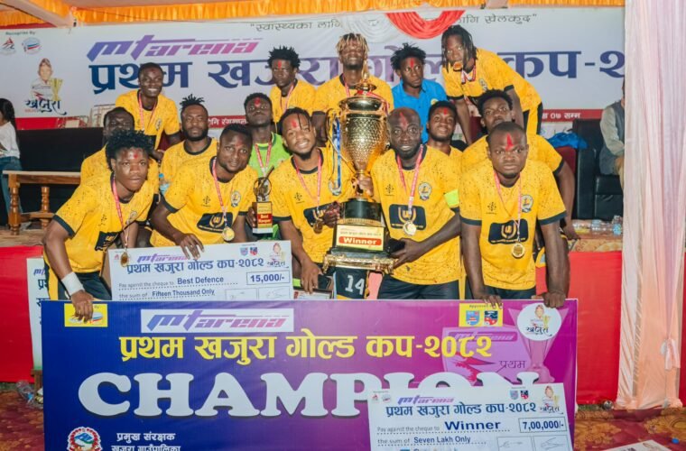 नेपालगन्ज । बाँकेको खजुरामा आइतबार सम्पन्न एमटी एरिना प्रथम खजुरा गोल्डकप फुटबल प्रतियोगिताको उपाधि नाइजेरियन टोली जष्ट जोन एफसीले जितेको छ ।