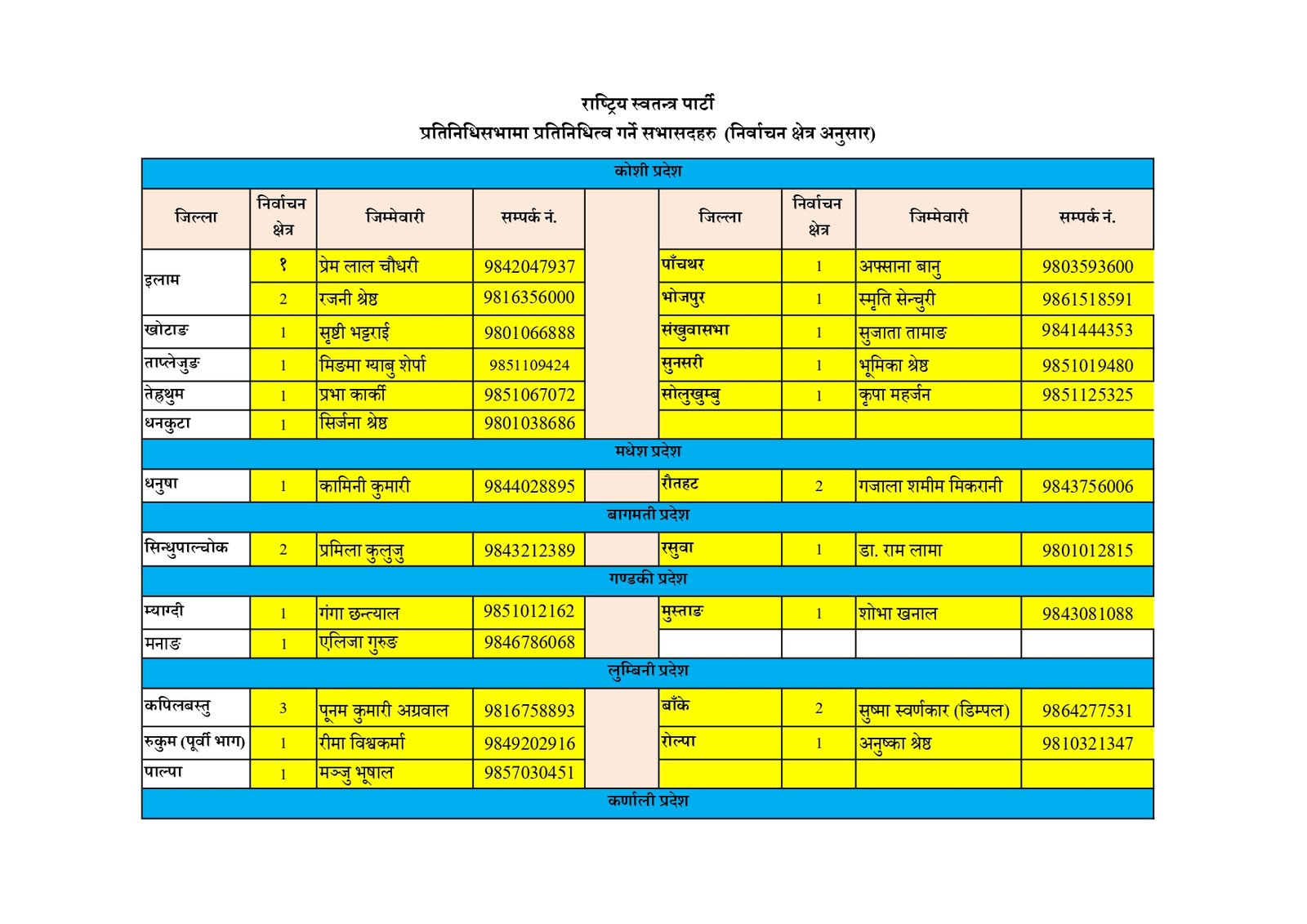 काठमाडौँ । राष्ट्रिय स्वतन्त्र पार्टी प्रतिनिधिसभामा प्रतिनिधित्व गर्ने समानुपातिक सांसदहरूको जिम्मेवारी तोकेको छ । आइतबार बसेको पार्टीको सचिवालय बैठकले प्रत्यक्षतर्फ नजितेका निर्वाचन क्षेत्रमा समानुपातिक सांसदहरूलाई जिम्मेवारी दिने निर्णय गरेको थियो ।