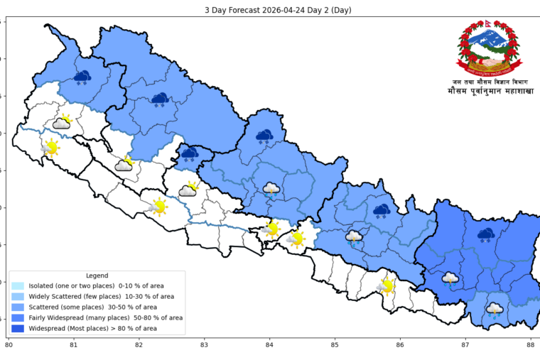 कोशी प्रदेशका हिमाली र पहाडी भागका केही, बागमती र  गण्डकी प्रदेशका हिमाली र पहाडी भाग तथा लुम्बिनी, कर्णाली र सुदूरपश्चिम प्रदेशका हिमाली भेग, कोशी प्रदेशका तराईका केही स्थानमा मेघगर्जन र चट्याङसहित मध्यम वर्षा एवं हिमपातको सम्भावना छ ।