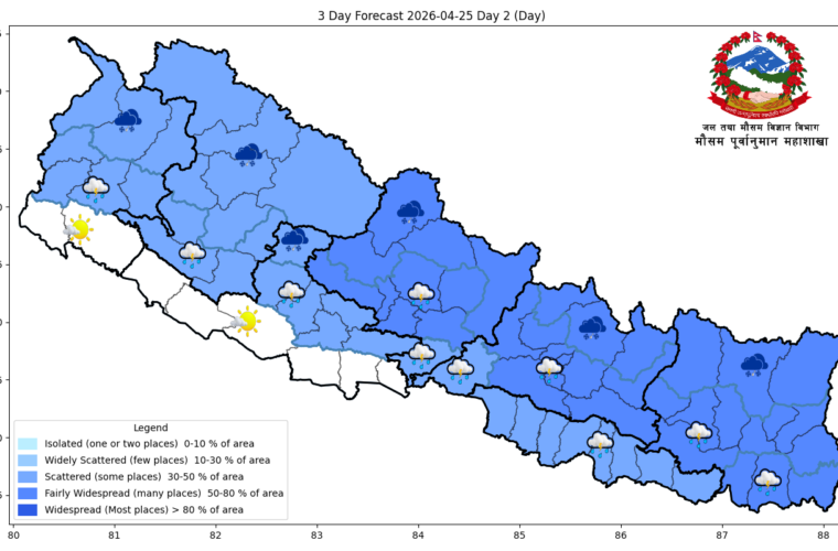महाशाखाका अनुसार आज दिउँसो देशका हिमाली तथा पहाडी भागमा सामान्यतया बदली रहने तथा तराई भेगमा आंशिक बदली रहनेछ । कोशी प्रदेशसहित बागमती र गण्डकी प्रदेशका हिमाली तथा पहाडी भागका केही स्थान तथा मधेश प्रदेशसहित बागमती र गण्डकी प्रदेशका तराई क्षेत्र र लुम्बिनी, कर्णाली तथा सुदूरपश्चिम प्रदेशका हिमाली एवं पहाडी भागका केही स्थानमा मेघगर्जन तथा चट्याङसहित मध्यम वर्षाको सम्भावना छ ।