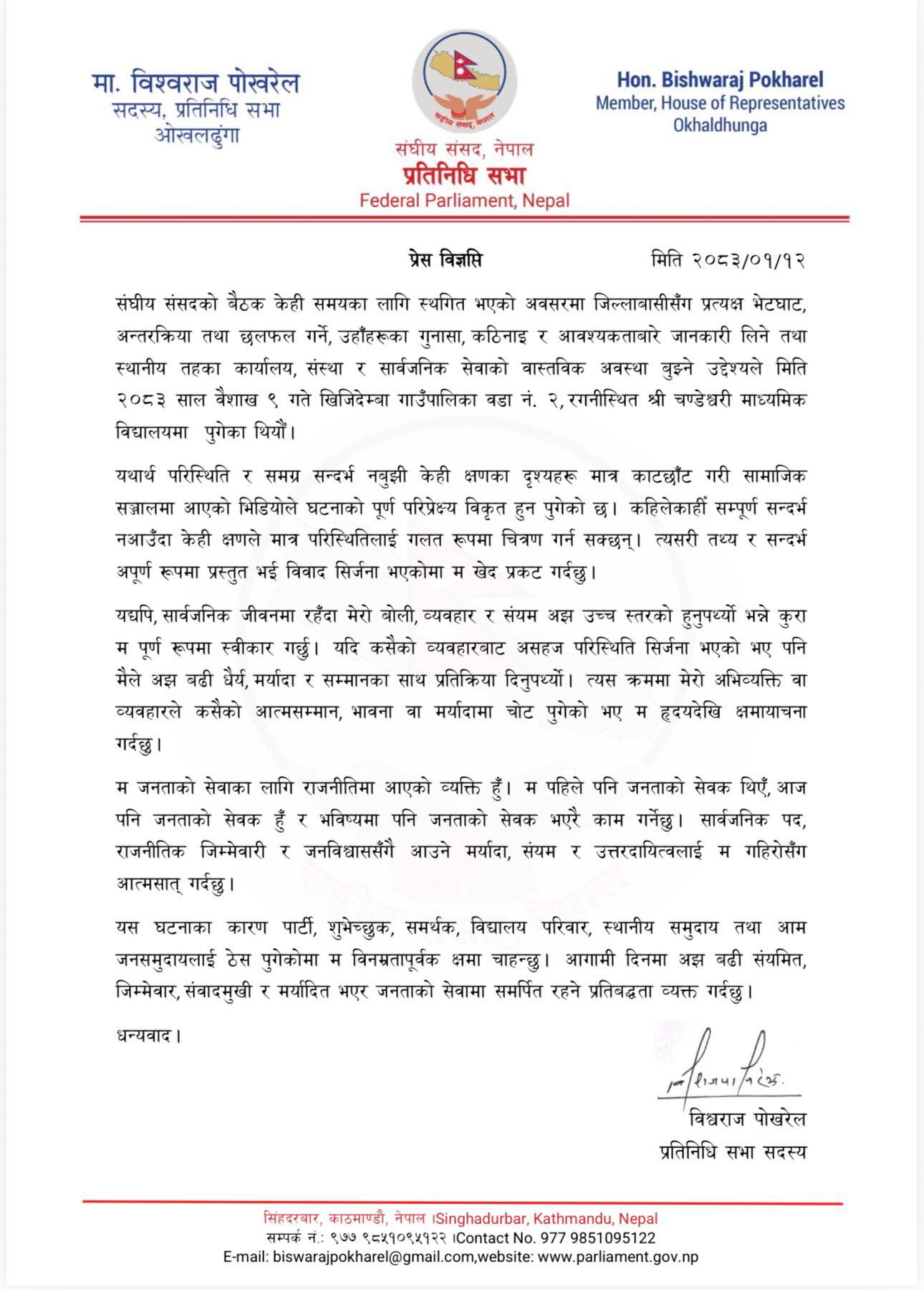 शनिबार विज्ञप्ति जारी गरी पोखरेलले आफ्नो गल्ती भएको स्वीकार्दै माफी मागेका हुन् । ओखलढुंगाको खिजिदेम्बा गाउँपालिका–२ रगनीस्थित चण्डेश्वरी माध्यमिक विद्यालयका प्रधानाध्यापक सन्तबहादुर मगरलाई गेटमा स्वागत गर्न नआएको भन्दै थर्काएको भिडियो सामाजिक सञ्जालमा भाइरल भएपछि उनको चौतर्फी आलोचना भएको थियो ।