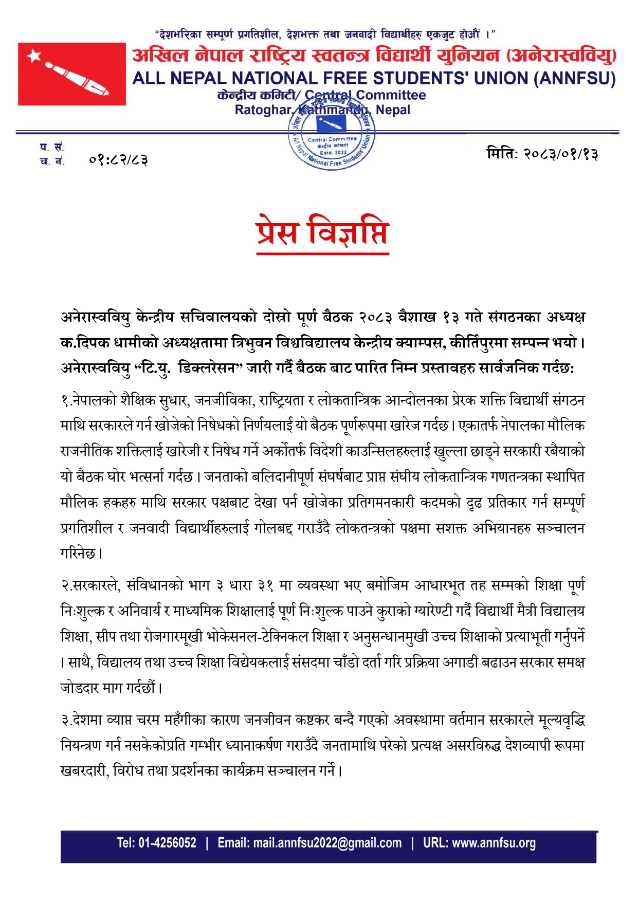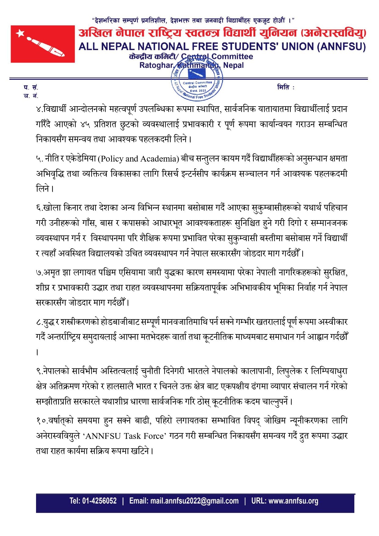 यस्तै, सार्वजनिक यातायातमा विद्यार्थीले पाउँदै आएको ४५ प्रतिशत छुटको व्यवस्था कार्यान्वयन, विद्यार्थीका गुनासो सुन्न ‘ANNFSU Student Outreach and Response Unit’ सञ्चालन गर्ने र विद्यार्थीहरूका लागि रिसर्च इन्टर्नसिपको व्यवस्था गर्न पनि माग गरिएको अध्यक्ष दीपक धामीले जानकारी दिए ।