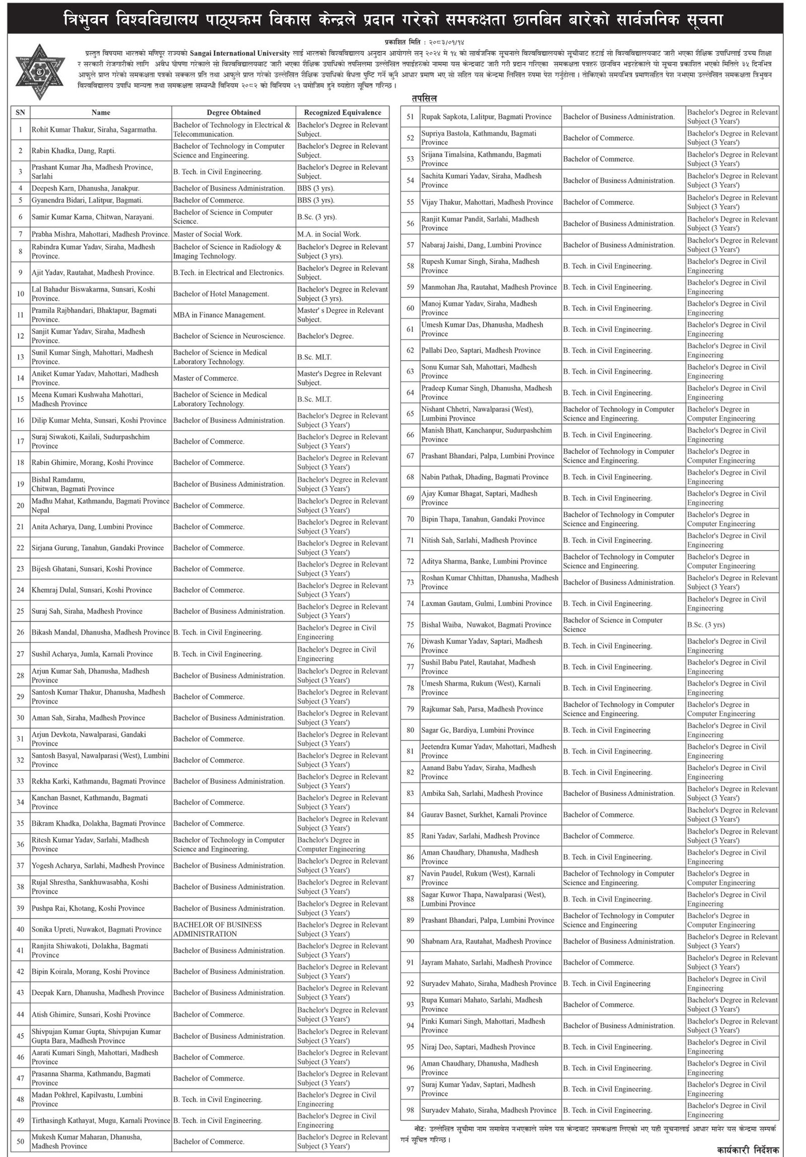 त्रिविले सोमबार सार्वजनिक सूचनामार्फत ९८ जनाको नाम सार्वजनिक गर्दै शैक्षिक उपाधिको वैधता पुष्टि हुने कागजात पेस गर्न ३५ दिने अल्टिमेटम दिएको हो ।