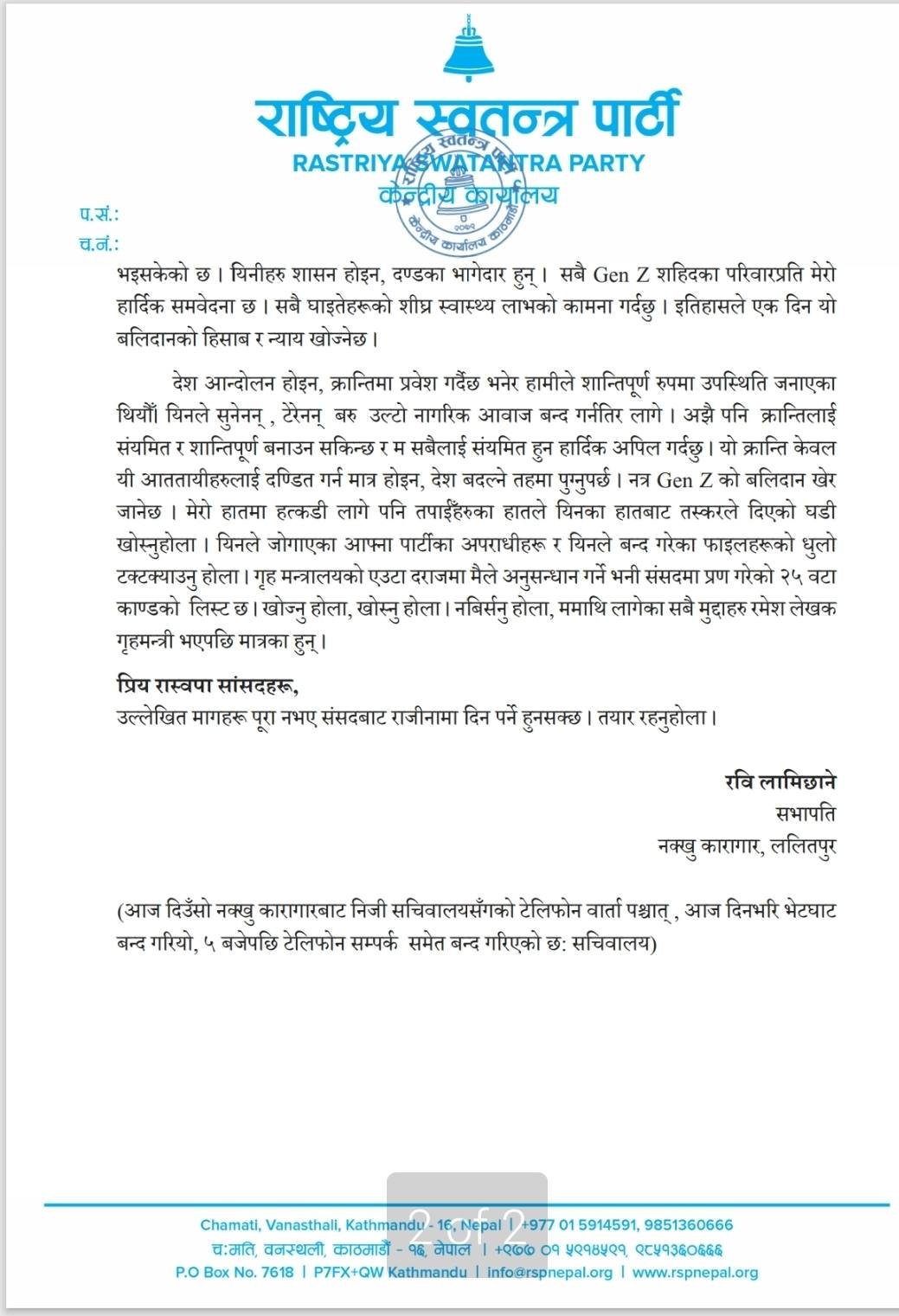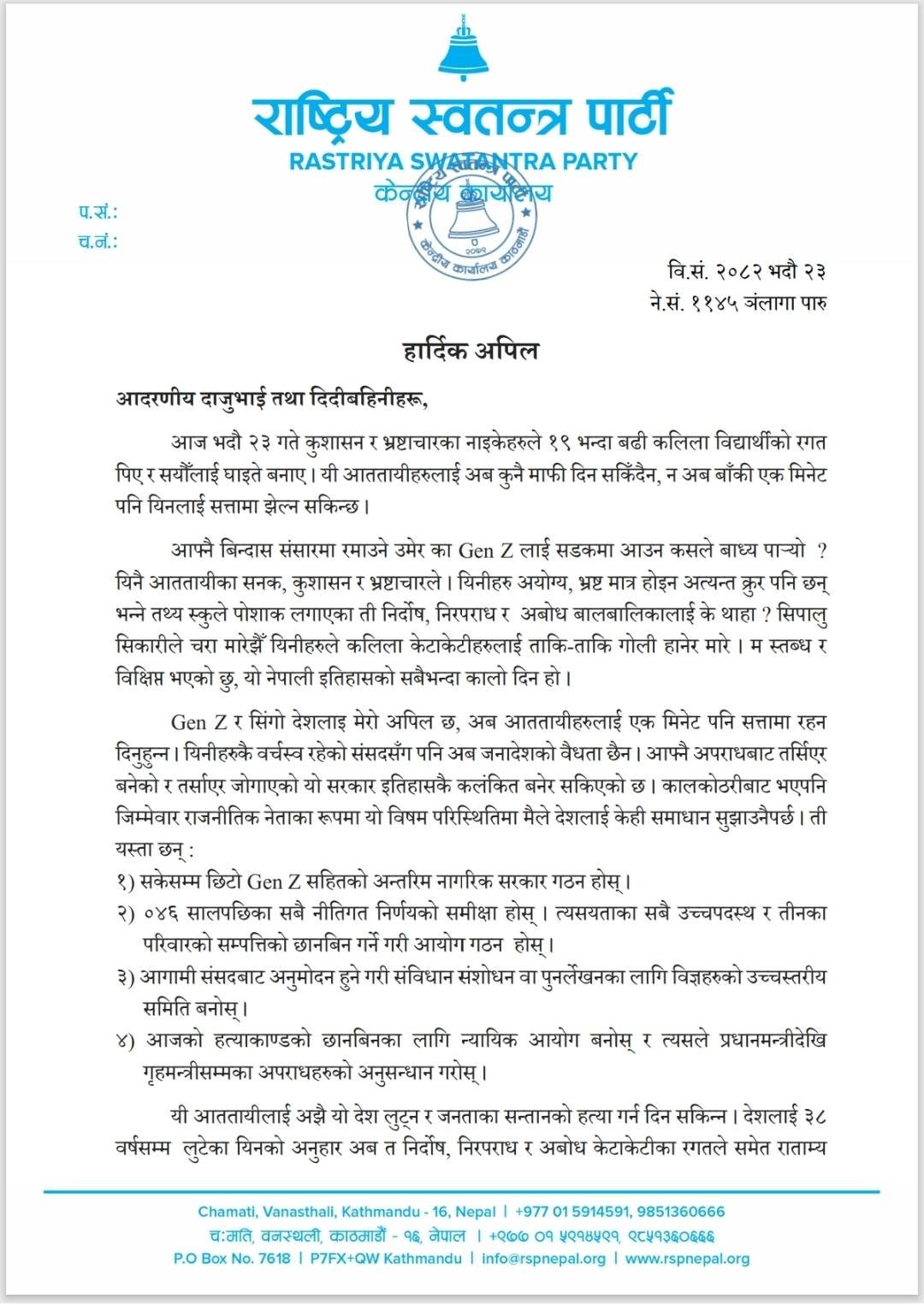 उनले भनेका छन्, ‘जेनजी र सिंगो देशलाई मेरो अपील छ, अब आततायीहरुलाई एक मिनेट पनि सत्तामा रहन दिनुहुन्न । यिनीहरुकै वर्चस्व रहेको संसदसँग पनि अब जनादेशको वैधता छैन । आफ्नै अपराधबाट तर्सिएर बनेको र तर्साएर जोगाएको यो सरकार इतिहासकै कलंकित बनेर सकिएको छ ।’