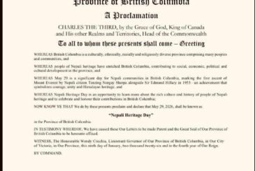 क्यानडाको ब्रिटिश कोलम्बिया प्रान्त सरकारद्वारा मे २९ लाई ‘नेपाल हेरिटेज डे’ को मान्यता २५ माघ, २०८२नेपाल समाजसमाज