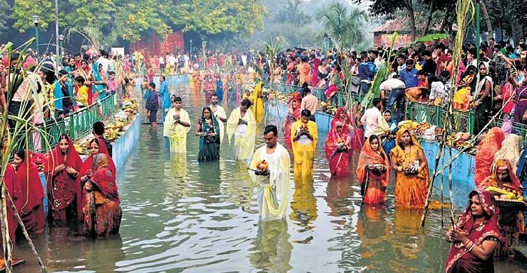 During the celebrations of Chhath Puja, a festival dedicated to the solar deity, hundreds of Hindu devotees stood knee-deep in the waters of rivers and ponds and sometimes even immerse themselves for a holy dip.