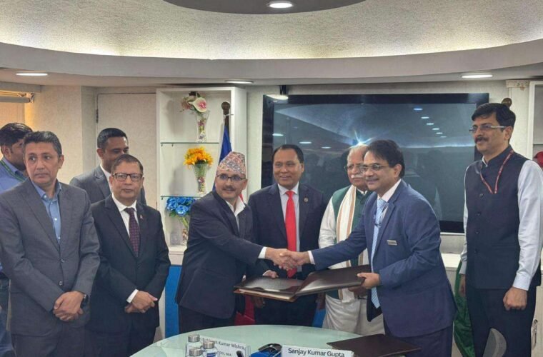Nepal Electricity Authority (NEA) Deputy Executive Director Subhash Kumar Mishra and Chief Operating Officer Sanjay Kumar Gupta at Power Grid Corporation of India Limited signed the agreement on behalf of their respective sides, in the presence of the two ministers.