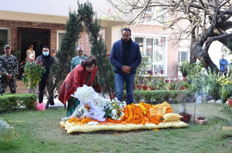 Minister Dr Rana reached the late Shah’s residence at Kalimati, Kathmandu this afternoon and paid last respects to the late one by offering a bouquet of flowers.