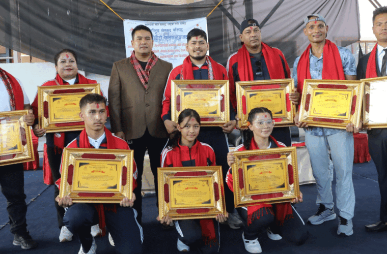 Also honored were Sani Singh, who won a gold medal in the open weight category at the South Asian Full Contact Karate Championship held in Sri Lanka; Dawa Sherpa, who earned a bronze medal in the solo kata event at the Tezuka Cup Full Contact Karate Championship in Japan; and Kedarman Sthapit, who secured a gold medal in the men’s 76 kg (above 50 years) category at the 12th World Strength Lifting & Incline Bench Press Championship held in Thailand.