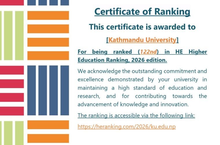 Kathmandu, March 24: The Kathmandu University (KU) of Nepal has been ranked 122nd among 507 universities from 95 countries in the ‘HE Higher Education Ranking’ conducted by a USA-based organization.