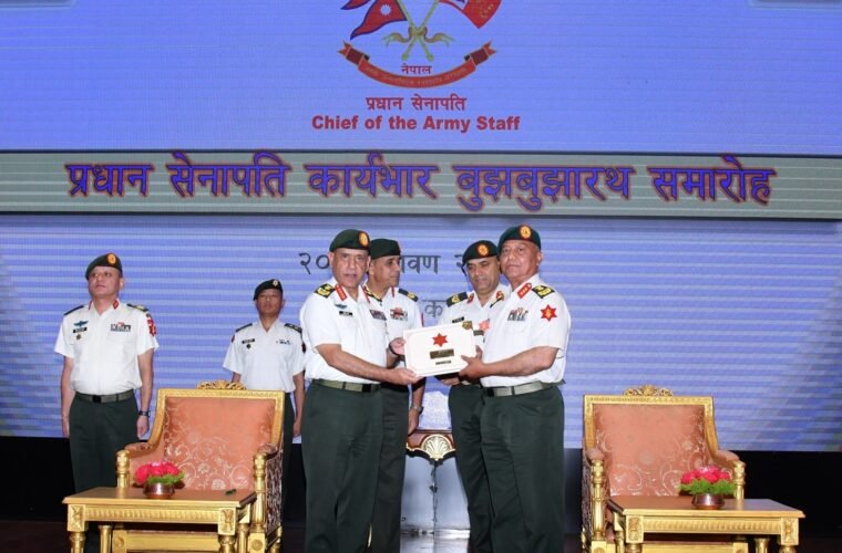 CoAS Prabhuram Sharma is going on a mandatory one month’s leave starting tomorrow, before formally retiring on September 9. Accordingly, CoAS Sharma handed over the leadership to Lieutenant General Sigdel at a function held at the Nepal Army Headquarters today, according to Directorate of Military Public Relations and Information.