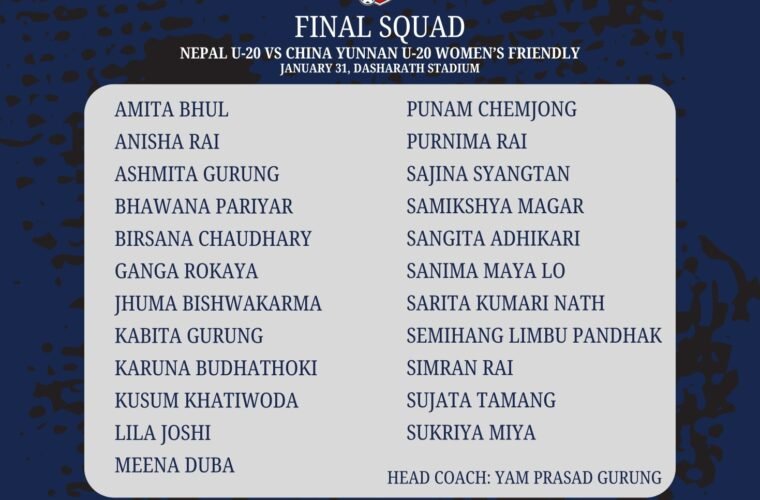 Kathmandu, Jan 27: The All Nepal Football Association (ANFA) has today announced a 23-member Nepali national U-20 women’s team for a friendly match against China’s Yunnan provincial youth team.