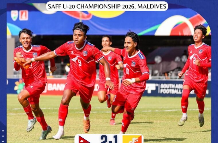Kathmandu, March 23: Nepal has defeated Bhutan in SAFF U-20 Championship. In today’s match held at National Football Stadium, Male, of Maldives, Nepal secured a victory over Bhutan by 2-1.
