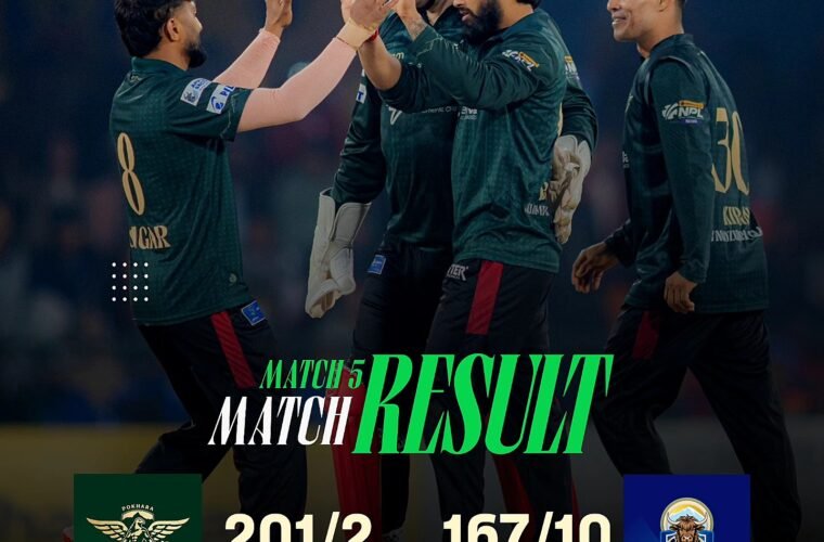 In the match played at Kirtipur-based TU International Cricket Ground on Tuesday, Pokhara Avengers defeated Karnali Yaks by 34 runs, depriving the latter of the opportunity for another match. Karnali Yaks was not able to secure more than two points from six matches.