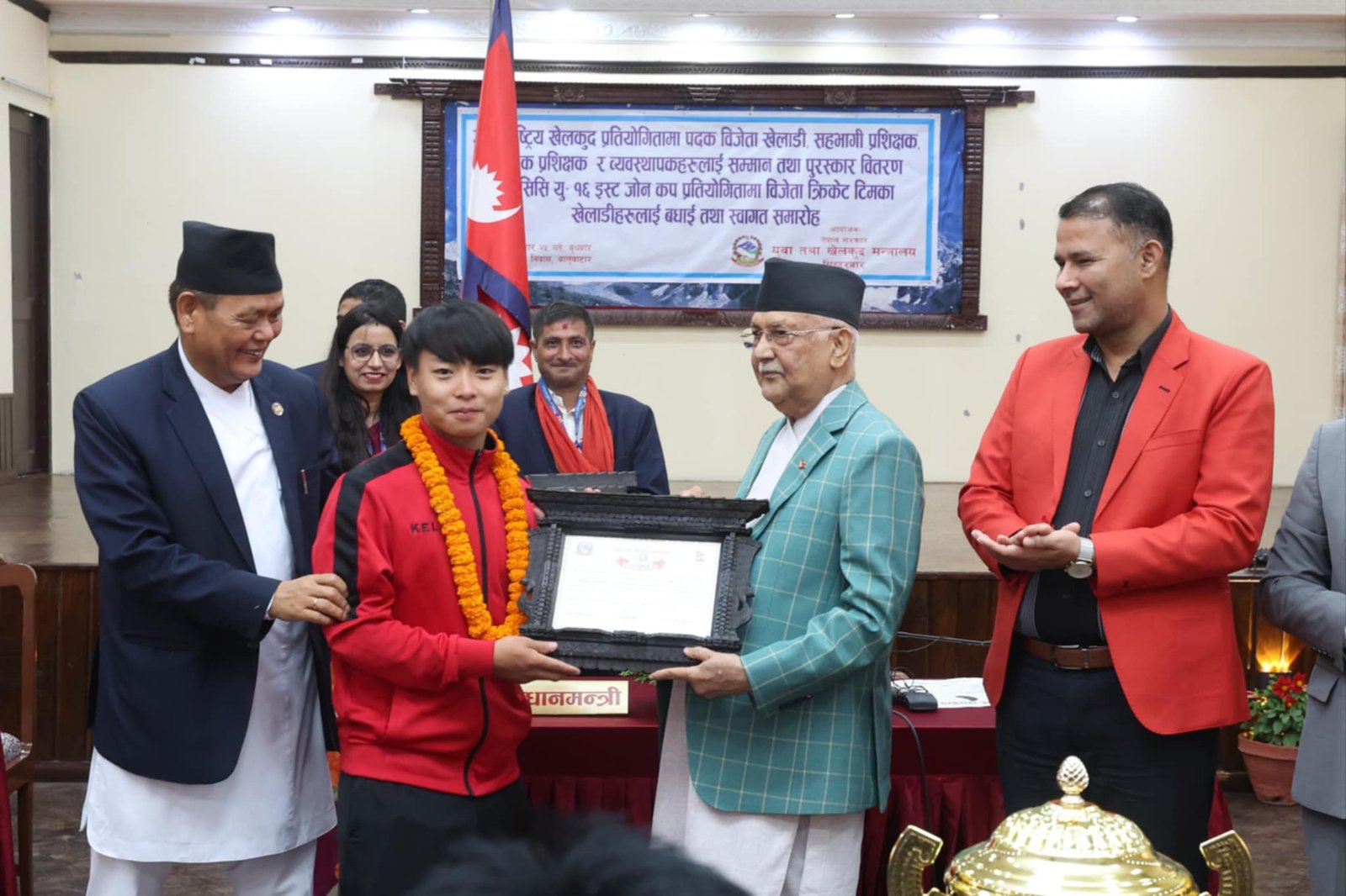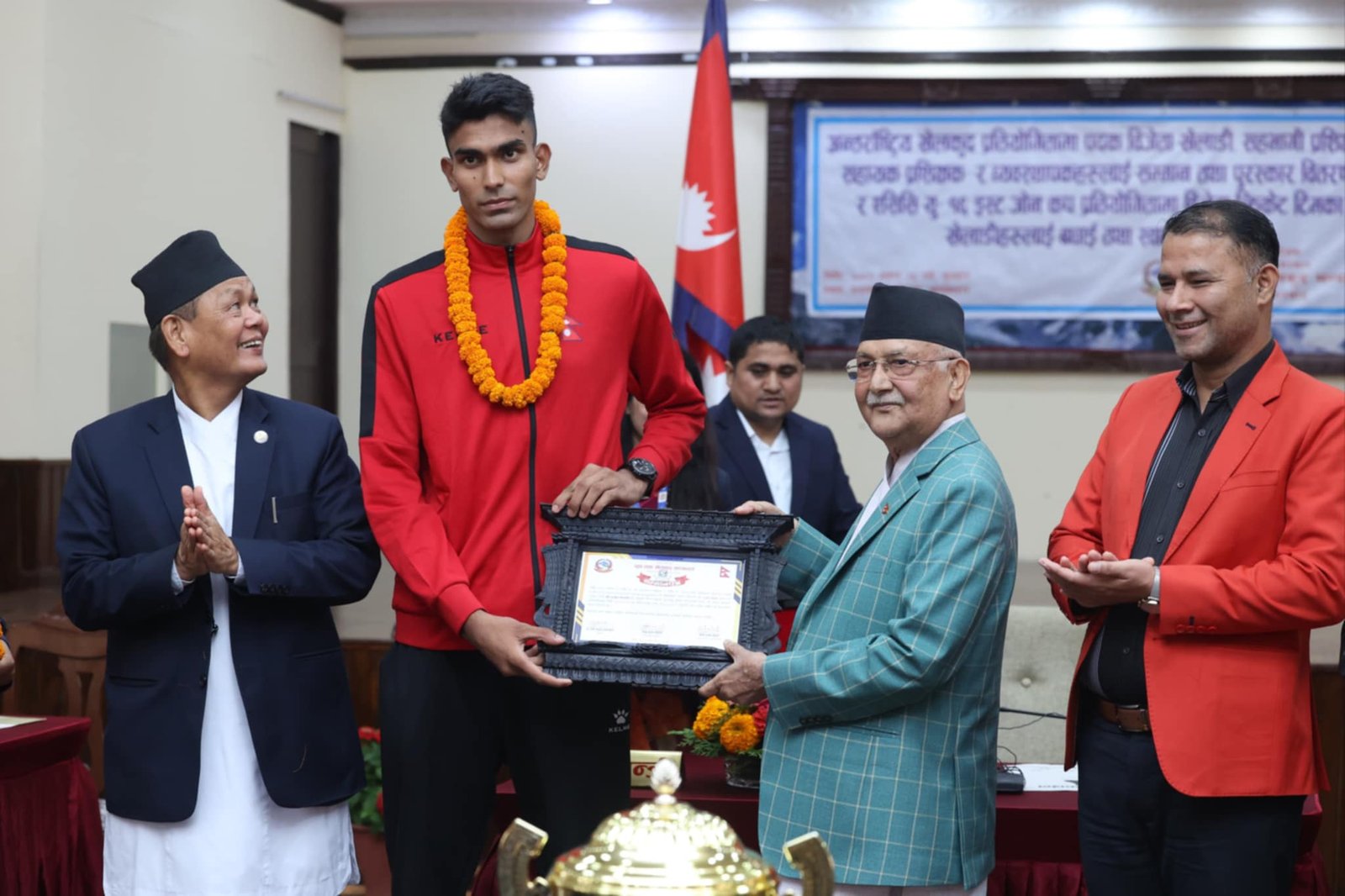Kathmandu, July 9: Prime Minister KP Sharma Oli today gave away various sports honors and awards to sportspersons, coaches and the managers for their wins for Nepal in various international competitions.