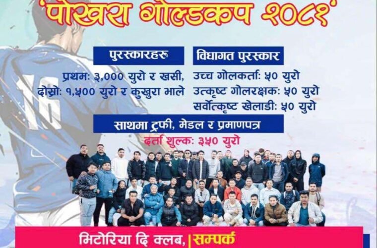 The seven-a-side football tournament will kick off from coming September 8 under the aegis of Pokhara Football Club (Pokhara FC) Portugal. The event is being organized also to mark the upcoming festivals of Badadashain and Tihar, Asbin Jung Thakuri, president of the club, said. The tournament is also expected to promote mutual support, cooperation and fraternity among the Nepali community in Europe.