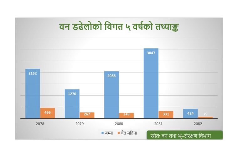 This number had decreased to 267 in Chaitra 2079. Similarly, 249 incidents of forest fire were reported in Chaitra 2080 and the number of forest fire incidents rose again to 331 in Chaitra 2081. In Chaitra 2082, however, only 79 fire incidents have been recorded so far, the lowest ever.