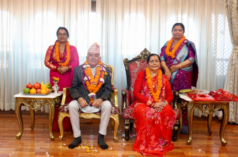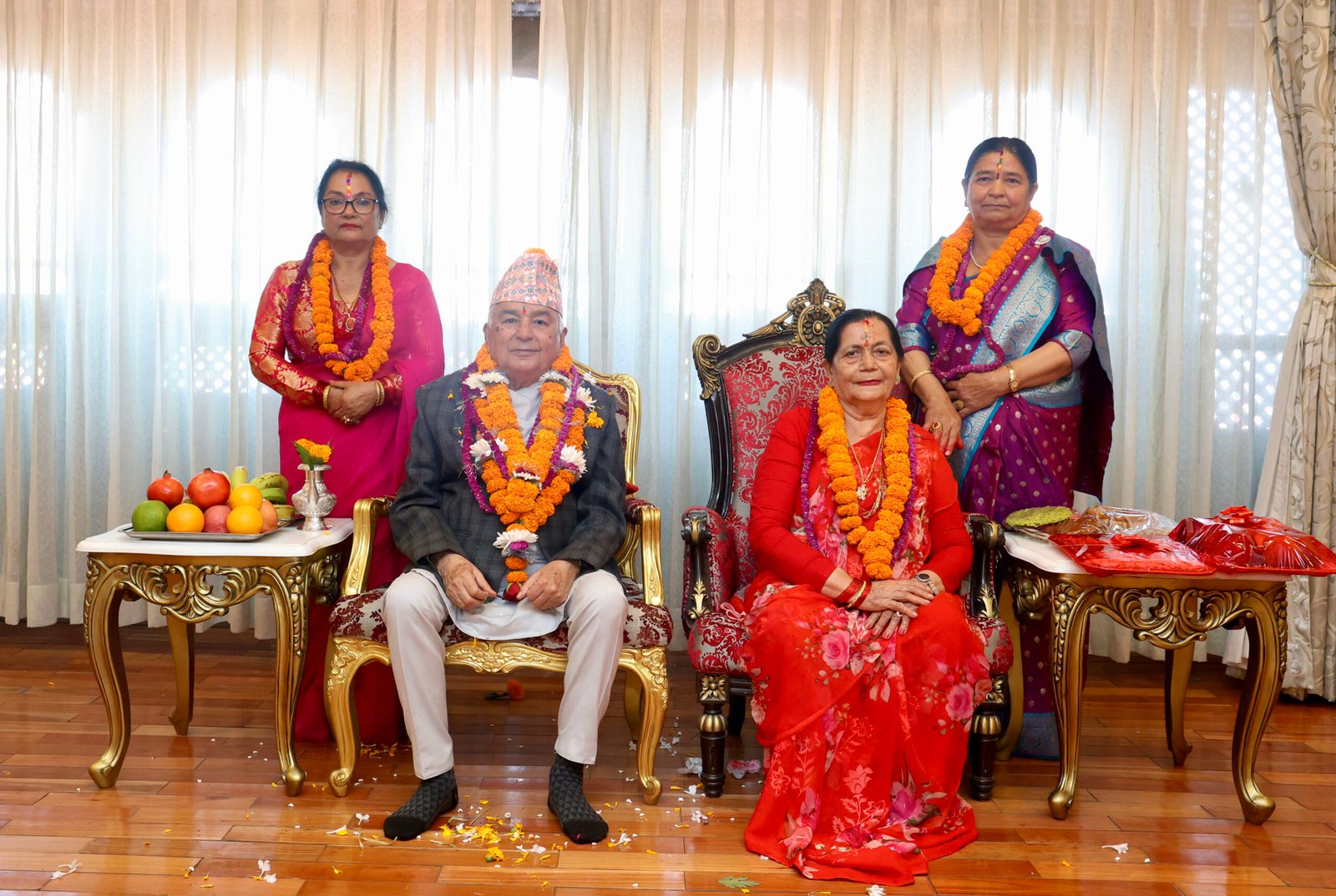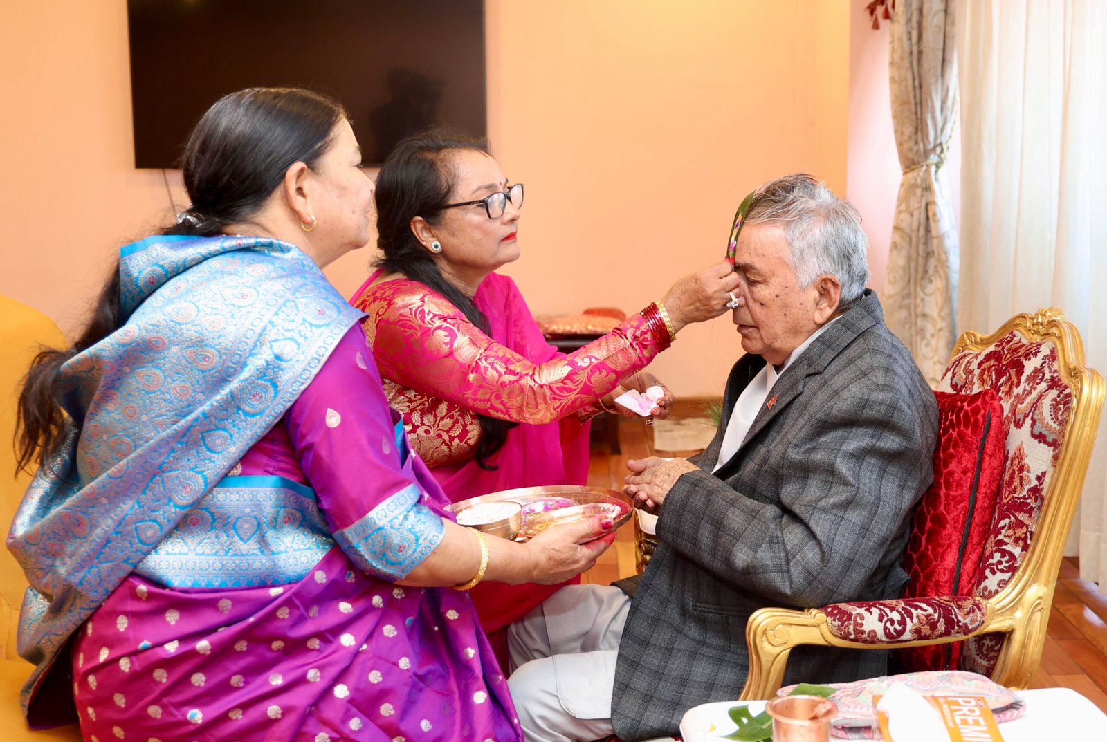 Kathmandu, Oct 23: President Ramchandra Paudel has received this year’s Tihar tika from his younger sisters Sharada Pandit and Chanda Ojha at the auspicious hour of 11:39 am at the President House, Shital Niwas today, the President’s Private Secretariat stated.