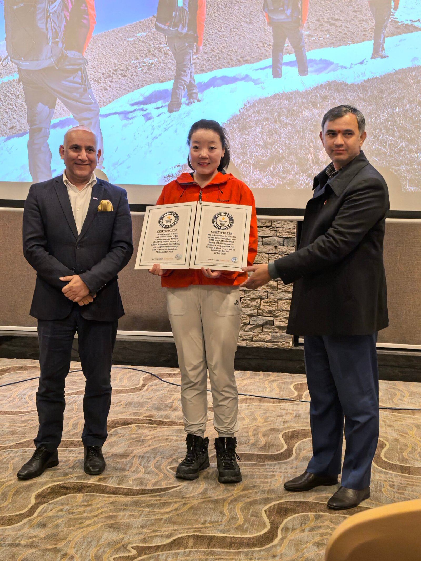 During the event, He Jing was presented with her Guinness World Records certificate for becoming the first woman to reach the true summits of all 14 eight-thousanders without supplemental (bottled) oxygen.