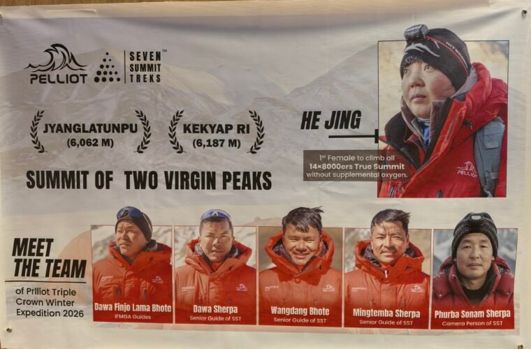 Led by renowned Chinese mountaineer He Jing, the team successfully summited Jyanglatunpu (6,062m) at 9:25 a.m. and Kekyap Ri (6,187m) at 12:45 p.m. on February 9, 2026. The double ascent marks the first winter climb of the two virgin peaks in the isolated Himalayan region.