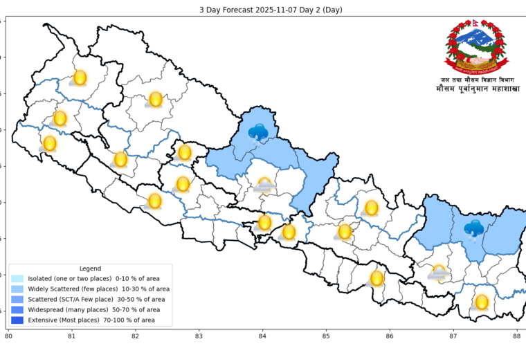According to the Weather Forecasting Division, there is a possibility of light rain or snowfall at one or two places in the mountainous regions of Koshi and Gandaki Provinces.
